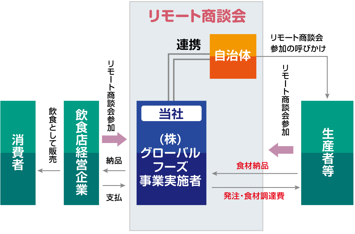 今回、新たな販路拡大策である産地リモート商談会開催により、生産者等からの食材流通を目指して いきます。また新たな飲食店企業と生産者を結び付けることで、飲食店企業からの需要が増加し、経常的に 生産者からの食材調達が可能な状態を目指していきます。